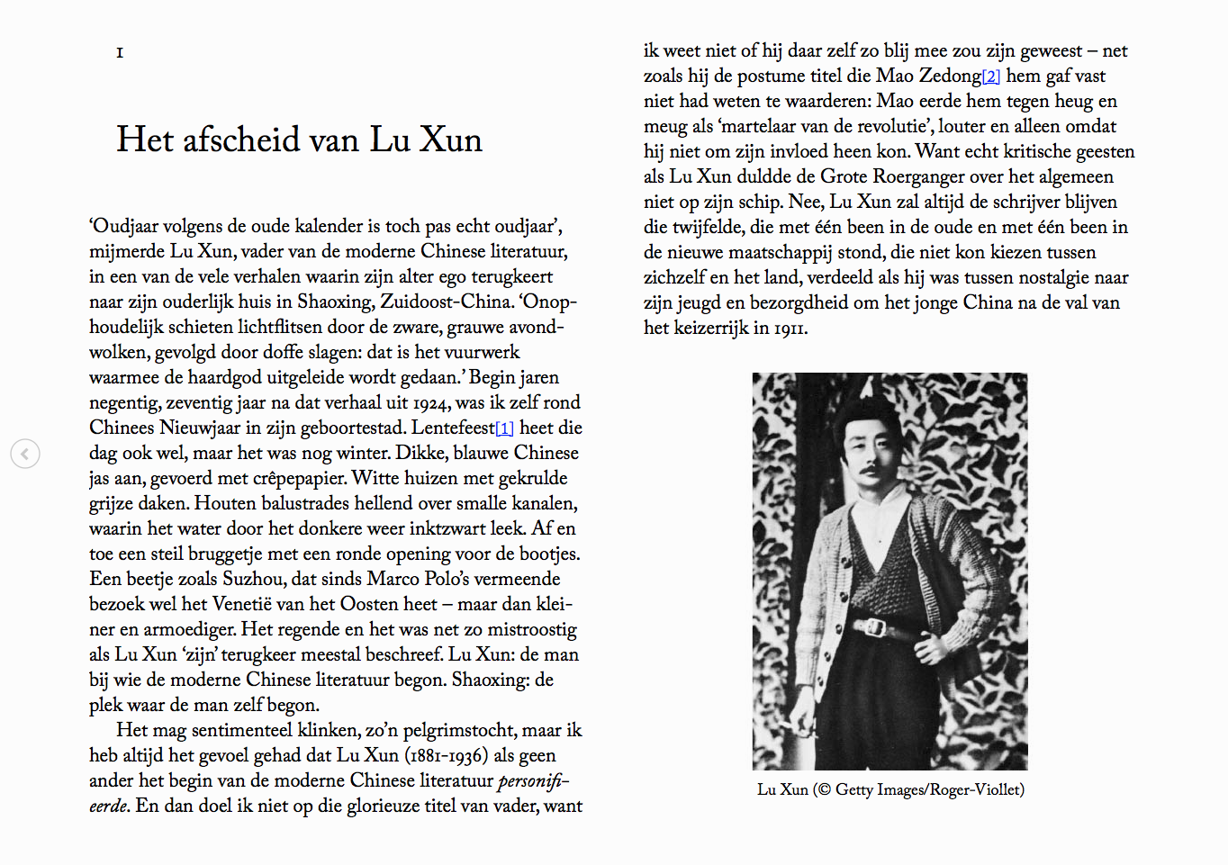 ‘Oudjaar volgens de oude kalender is toch pas echt oudjaar’, mijmerde Lu Xun, vader van de moderne Chinese literatuur, in een van de vele verhalen waarin zijn alter ego terugkeert naar zijn ouderlijk huis in Shaoxing, Zuidoost-China. ‘Onophoudelijk schieten lichtflitsen door de zware, grauwe avondwolken, gevolgd door doffe slagen: dat is het vuurwerk waarmee de haardgod uitgeleide wordt gedaan.’ Begin jaren negentig, zeventig jaar na dat verhaal uit 1924, was ik zelf rond Chinees Nieuwjaar in zijn geboortestad. Lentefeest heet die dag ook wel, maar het was nog winter. Dikke, blauwe Chinese jas aan, gevoerd met crêpepapier. Witte huizen met gekrulde grijze daken. Houten balustrades hellend over smalle kanalen, waarin het water door het donkere weer inktzwart leek. Af en toe een steil bruggetje met een ronde opening voor de bootjes. Een beetje zoals Suzhou, dat sinds Marco Polo’s vermeende bezoek wel het Venetië van het Oosten heet – maar dan kleiner en armoediger. Het regende en het was net zo mistroostig als Lu Xun ‘zijn’ terugkeer meestal beschreef. Lu Xun: de man bij wie de moderne Chinese literatuur begon. Shaoxing: de plek waar de man zelf begon.