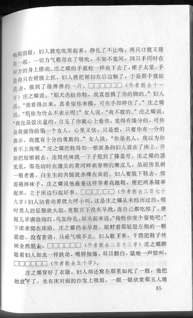 Bladzijde uit Jia Pingwa’s Vervallen stad, met blanco blokjes gevolgd door de tekst: ‘hier heeft de auteur zo-en-zoveel karakters geschrapt’.