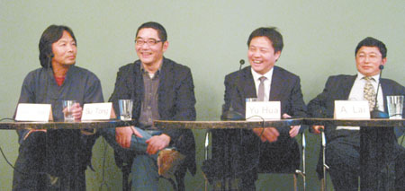 De Chinese Literature Night in het Literaturhaus, met v.l.n.r. Liu Zhenyun, Su Tong, Yu Hua en A Lai