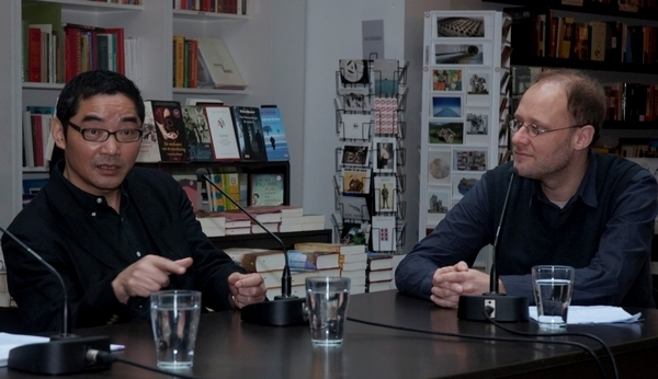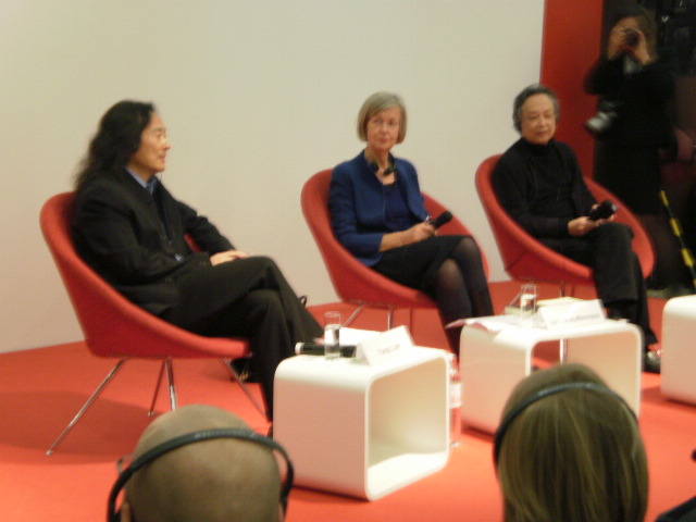 Daarnaast had je bijvoorbeeld het tweegesprek tussen de vrijwillige ballingen Gao Xingjian (1940) en Yang Lian (1955), waarvoor het meer westers-Chinees gemengde publiek zich in stille afwachting tussen de beursstands wrong. Voormalig ‘duistere dichter’ Yang Lian verkoos na het Tian’anmen-incident van 1989 de ballingschap en woont tegenwoordig in Londen; Nobelprijswinnaar Gao Xingjian besloot om dezelfde reden niet meer weg te gaan uit Parijs, de stad waar hij zich een paar jaar eerder als schrijver en schilder had gevestigd. Gao oogstte een grimmig applausje toen hij zijn bekende opvatting van ‘koude literatuur’ nog eens uiteenzette: een schrijver dient volgens hem niet te schrijven voor de politiek of de markt maar louter voor zichzelf, een vrijheid die hij in zijn geval alleen buiten China vond. Maar verder verloren de twee zichtbaar de aandacht van de toeschouwers door hun wel erg abstracte bespiegelingen over het individu, het Zelf en de Ander. In feite was het een herhaling van hun eerder in het Duits verschenen schriftelijke dialoog Was hat uns das Exil gebracht? uit 2001: een bevlogen discussie over vorm en inhoud, techniek en taal – waarover straks meer –, maar iets te zwaar voor op een drukke beursvloer.[3]