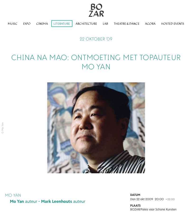 ‘Het leek wel of je als Chinees auteur alleen meetelde als je je openlijk over dergelijke zaken uitsprak,’ merkte Su Tong (1963), bekend van De rode lantaarn en Rijst, sarcastisch op toen ik hem kort na de beurs in Brussel interviewde over zijn writer-in-residenceschap bij Passa Porta. Zijn al even gevierde collega Mo Yan (1956), schrijver van Het rode korenveld, die ik dezelfde oktobermaand interviewde in het Brusselse Paleis voor de Schone Kunsten, verzuchtte dat hij het liever had gehad over werkelijk literaire dingen als compositie, karaktertekening, vertelexperimenten.